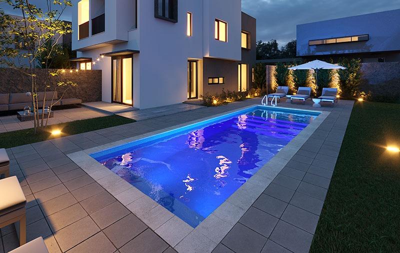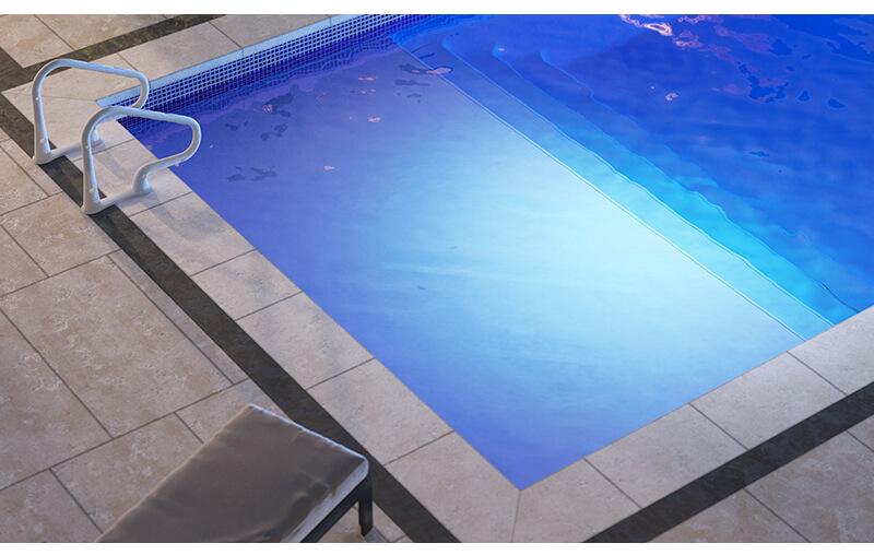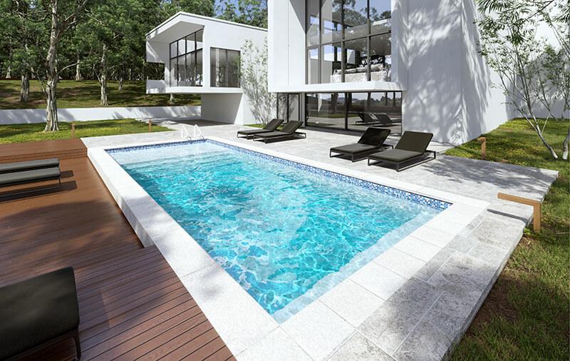 The *Aqua Menam A* pool features rectangular shapes, designed to make the best use of space. It also has porcelain tiles from *Atlas* on the pool's edges. The pool is available in the following sizes:* 5 meters (without seating),* 7 meters (without seating),* 9 meters (with seating),* 10 meters (with seating), without tiles. It is also available in the following sizes with tiles on the edges:* 5 meters (without seating),* 7 meters (without seating),* 10 meters (with seating).