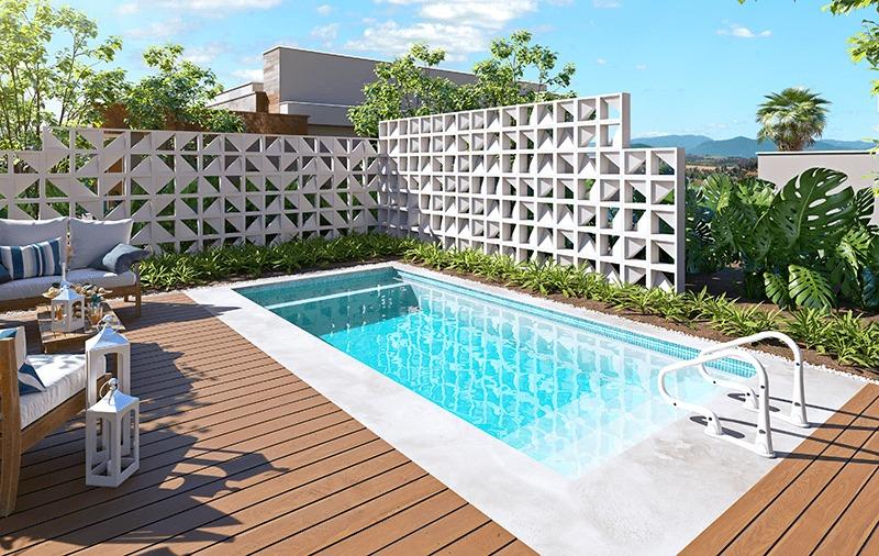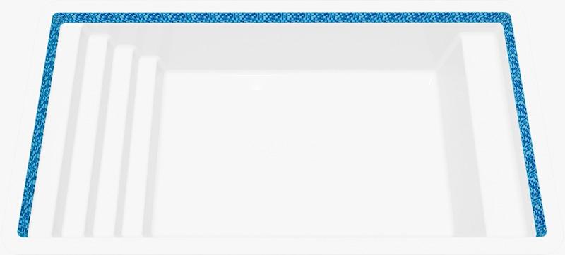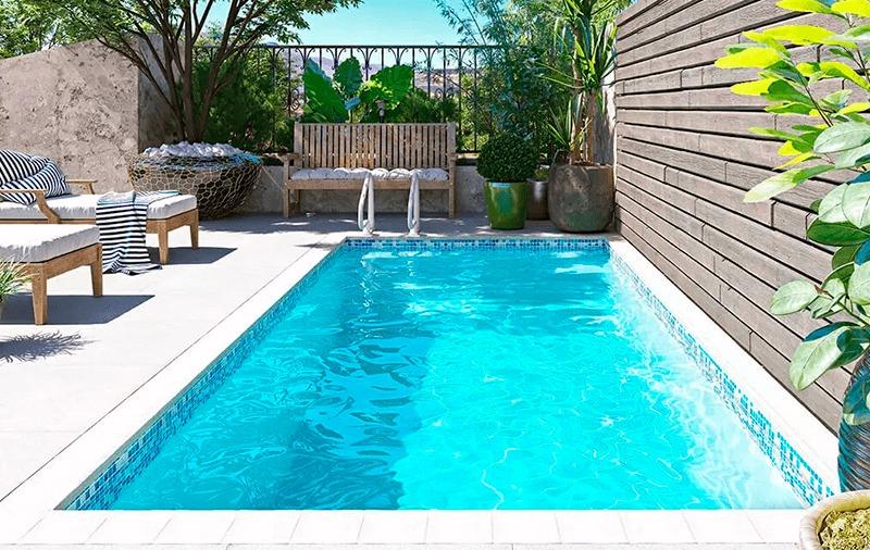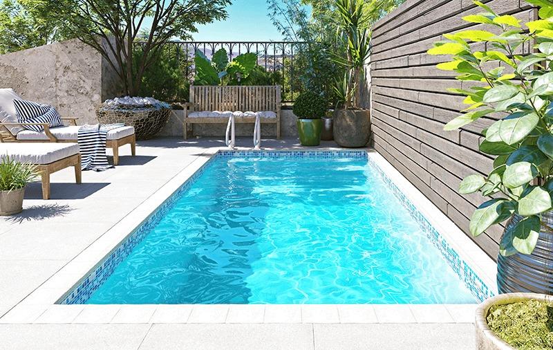 Aqua Menam G has received a special touch with the mosaic-covered edges of the inner walls. This pool model features a traditional design, with a bench and stairs on opposite sides, making excellent use of the available space."
